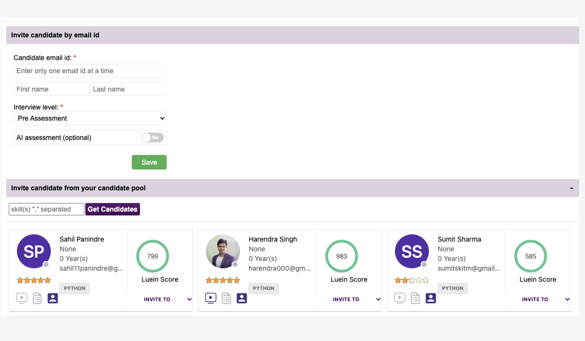 - If you already have a shortlisted candidates or applicants pool, then invite them all easily for an automated video pre-hire assessment with just an email address.
