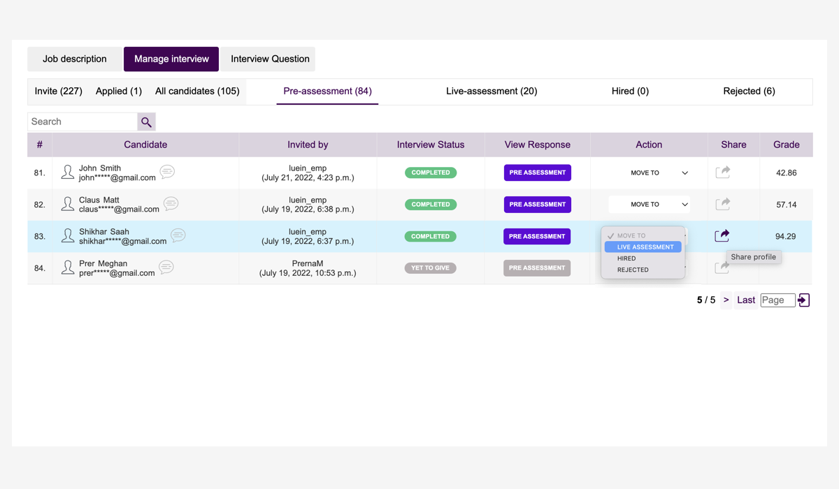 - Use AI auto-grading features to mass eliminate unfit candidates or grade it manually.
